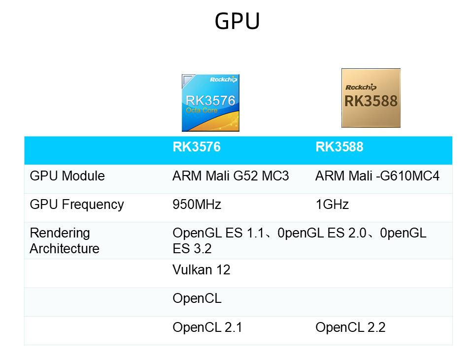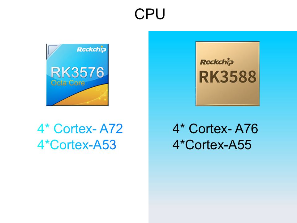سی پی یو کی کارکردگی: آر کے 3588 میں کواڈ کور کورٹیکس-اے 76 + کواڈ کور کورٹیکس-اے 55 کا استعمال کیا گیا ہے ، جبکہ آر کے 3576 میں کواڈ کور کورٹیکسا 72 + کواڈ کور کورٹیکس-اے 53 کو لاگت کے تحفظات کے لئے استعمال کیا گیا ہے ، اور یہ بازو کارٹیکس ایم 0 کوپروسیسر کے ساتھ لیس ہے۔
