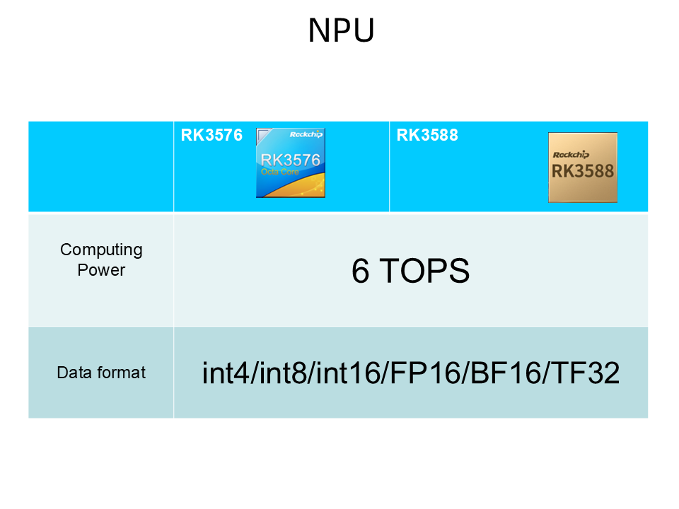 RK3588 اور RK3576 6TOPS کمپیوٹنگ پاور سے لیس ہیں ، ڈیٹا فارمیٹس جیسے INT4INT8/INT16/FP16/BF16/TF32 ، اور AI کی متعدد قسم کے لئے موزوں ہیں۔ منظرنامے
