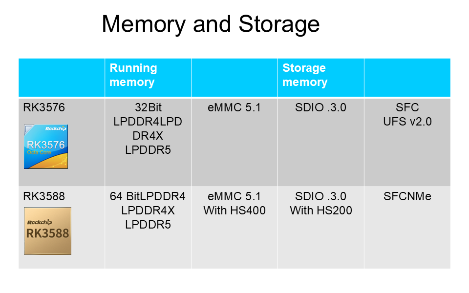 RK3576 سپورٹ کرتا ہے32 بٹLPDDR4/LPDDR4X/LPDDR5 ، اور EMMC5.1 ، SDI03.0 اور SFC ، نیز UFS V2.0 کی حمایت کرتا ہے