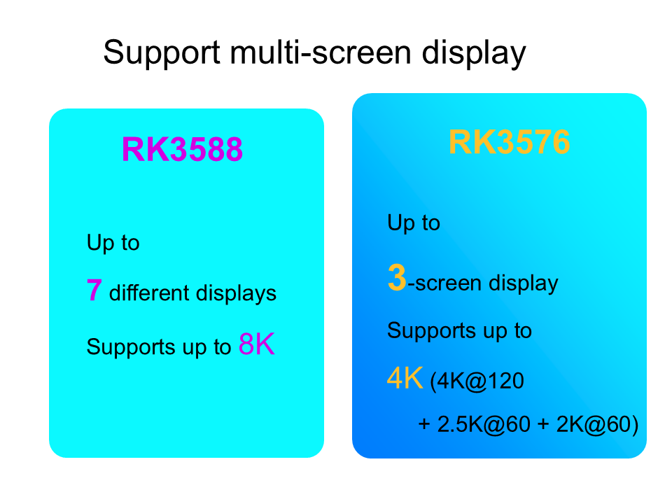 RK3588 اور RK3576 دونوں ایک سے زیادہ اسکرینوں اور مختلف عام ڈسپلے انٹرفیس کی حمایت کرتے ہیں۔