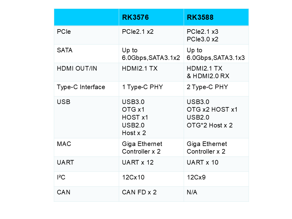 RK3588 اور RK3576 دونوںمختلف مصنوعات کی درخواست کی ضروریات کو پورا کرنے کے لئے پی سی آئی/ سیٹا/ ٹائپ سی/ ٹائپ سی/ یو ایس بی 3.0/ USB2.0/ ڈوئل نیٹ ورک پورٹس/ ایک سے زیادہ سیریل بندرگاہوں سمیت ، بھرپور انٹرفیس کنفیگریشن سے لیس ہیں۔